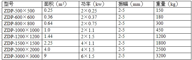 注:此表為上、下振形式振動平臺技術(shù)參數(shù),僅供參考;此外可以根據(jù)用戶實際使用需要定做臺面大小來選用振動電機(jī)數(shù)量及功率。